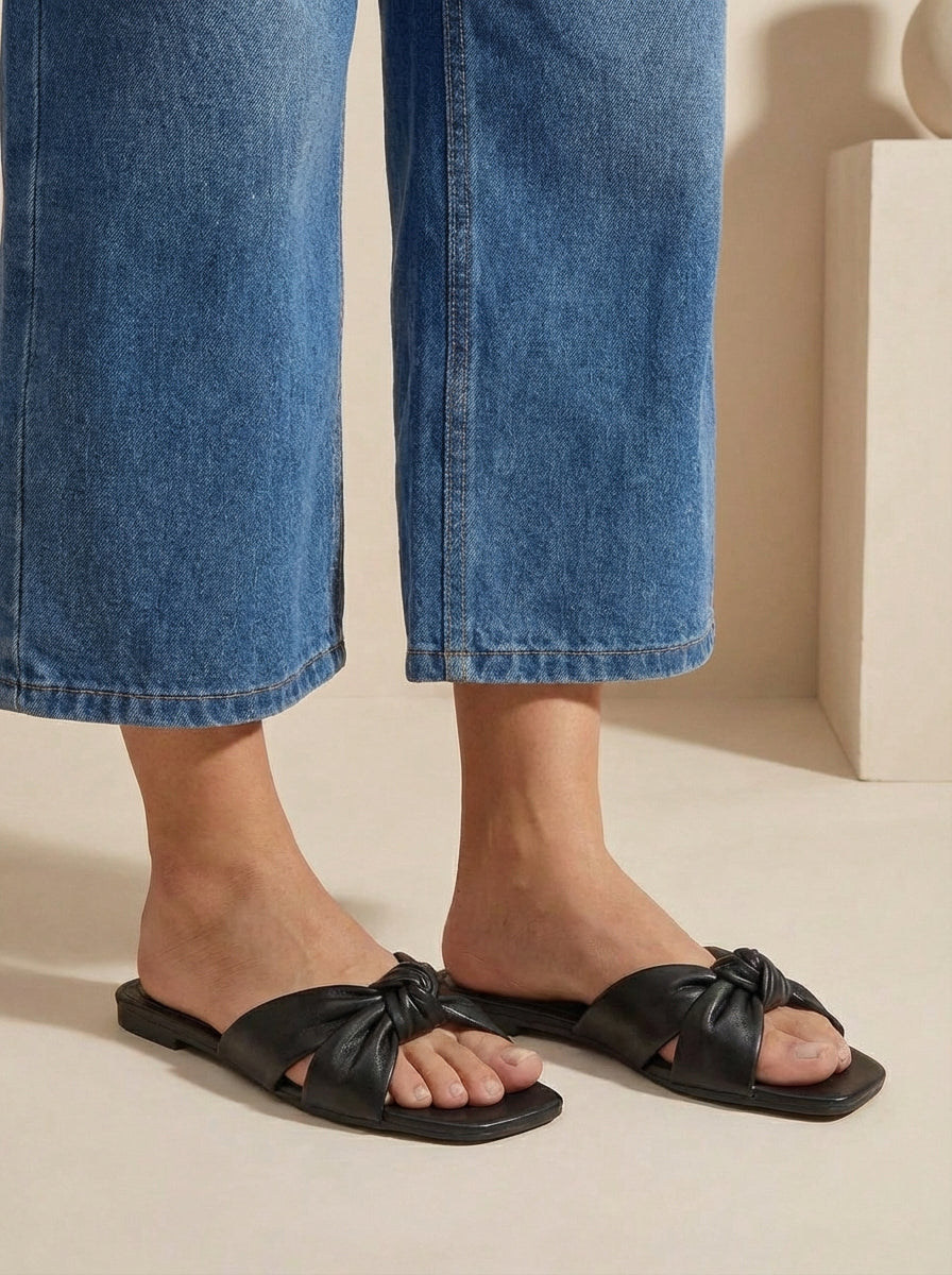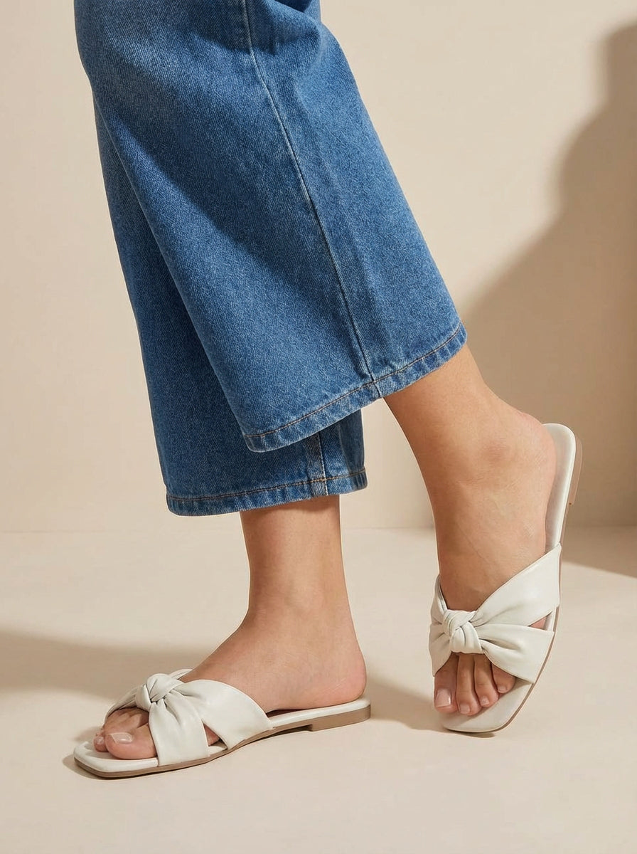 Sandalias planas blancas y negras con moño – estilo casual y versátil todo el año Estas sandalias planas combinan diseño minimalista y funcionalidad, ideales para acompañarte en días de descanso, vacaciones o salidas informales. Con un elegante acabado en blanco y negro, su diseño abierto de punta cuadrada y detalle de moño cruzado las convierte en el par perfecto para elevar cualquier look sin esfuerzo. Fabricadas en vinipiel (cuero sintético) con forro interior sintético y suela de goma de 4 mm, ofrecen una pisada ligera y estable. Perfectas para usar de día o de noche, combinan fácilmente con vestidos fluidos, shorts, jeans o conjuntos playeros. Su estilo se adapta a lo casual, urbano, relajado y playero, siendo un básico versátil para cualquier temporada.